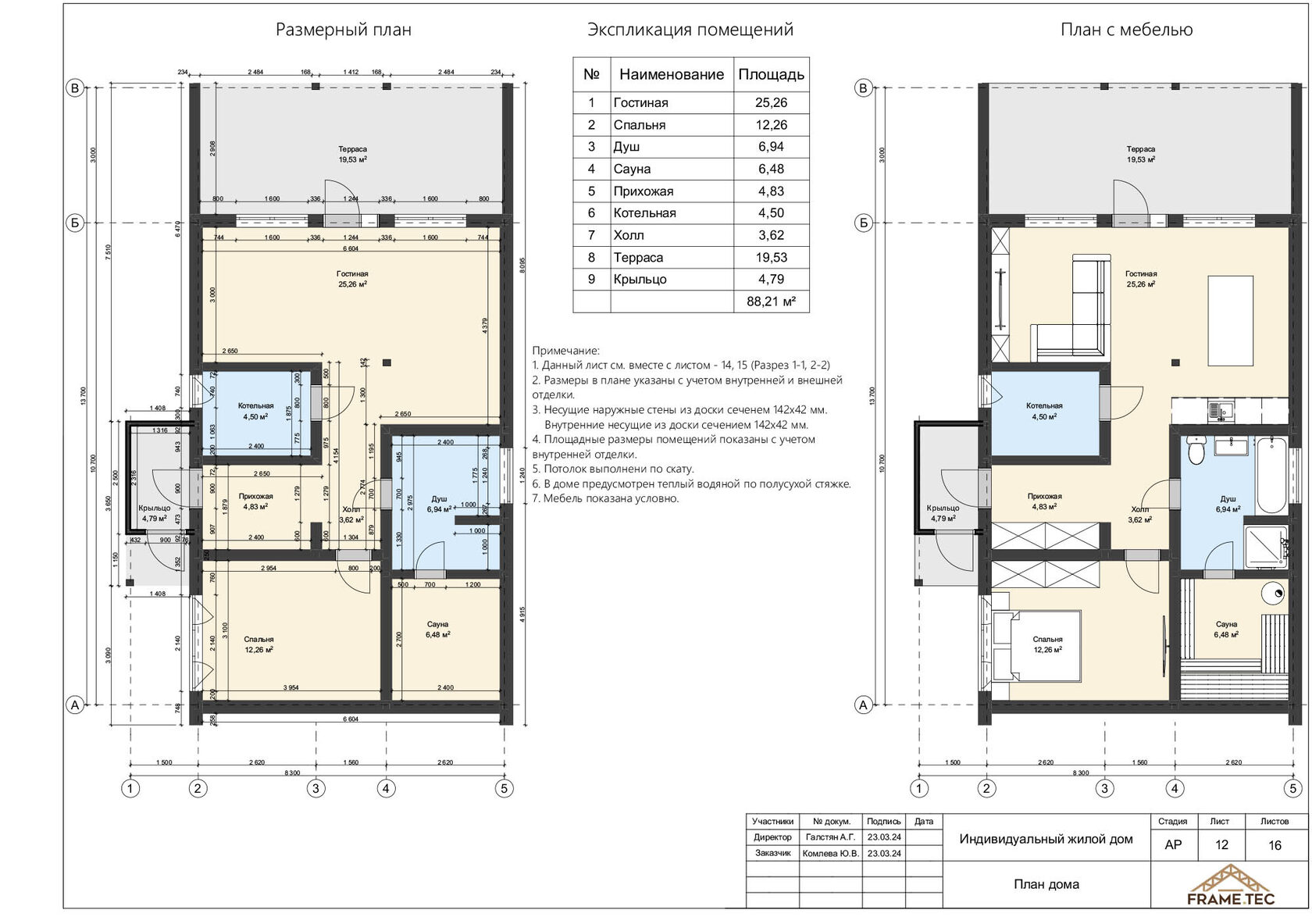 Площадь помещений дома – 88 м²